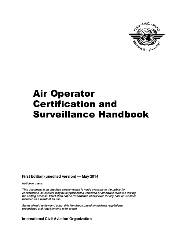 This handbook is intended to provide detailed instructions for [State CAA] staff to conduct air operator certification, surveillance and resolution of safety issues. It is divided into three volumes: Volume I outlines the policy and procedures to be followed by [State CAA] and operators for the initial issuance of an AOC; Volume II outlines the policies and procedures related to operational demonstrations, inspections, approvals and surveillance; while Volume III contains policies and procedures for airworthiness inspections, approvals and surveillance. Many of the inspections required for the initial certification of an air operator will subsequently be repeated during the implementation of [State CAA] surveillance programme.