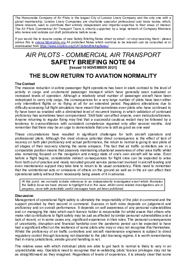 Air Pilots - Commercial Air Transport SAFETY BRIEFING NOTE 04: The Slow Return to Aviation Normality