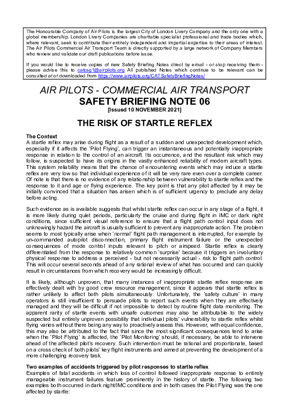 Air Pilots - Commercial Air Transport SAFETY BRIEFING NOTE 06: The Risk of Startle Reflex