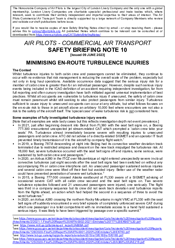Air Pilots Safety Briefing Note 10 - Minimising En-Route Turbulence Injuries
