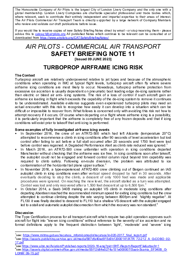 Air Pilots Safety Briefing Note 11 - Turboprop airframe icing risk