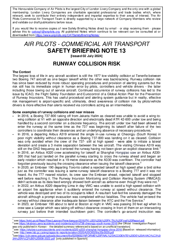 Air Pilots Safety Briefing Note 13 - Runway Collision Risk