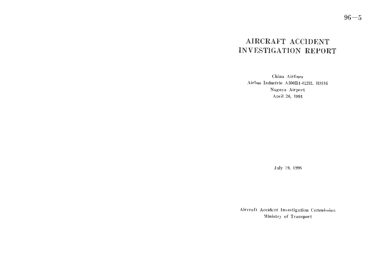 Aircraft Accident Investigation Report 96-5, Airbus A300, Nagoya Airport, Japan 26 April, 1994