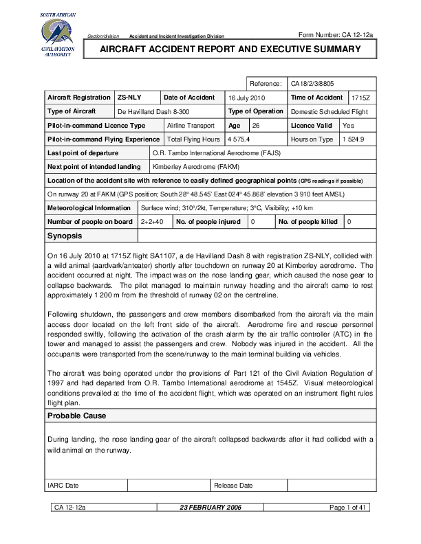 On 16 July 2010, a South African Express Airways Bombardier DHC 8-300 hit an animal during a night landing at Kimberley after a passenger flight from Johannesburg. The nose landing gear took a direct hit and collapsed but after a temporary loss of directional control, the runway centreline was regained and the aircraft brought to a stop. The Investigation found wildlife access to the aerodrome was commonplace and the attempts at control inadequate.
