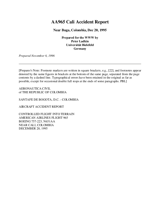 On 20 December 1995, an American Airlines Boeing 757-223, crashed into mountainous terrain while descending to land at Cali, Colombia, at night without flying a published arrival and approach procedure.
