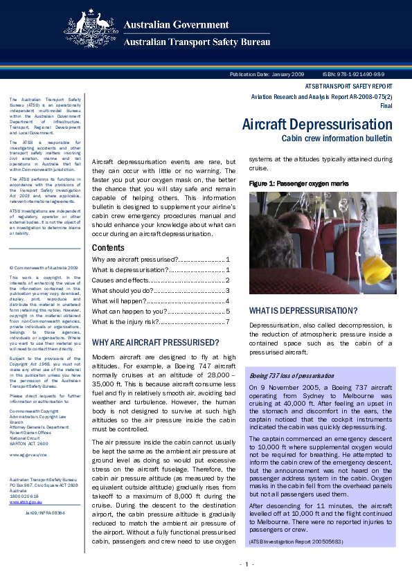 This information bulletin is designed to supplement your airline™s cabin crew emergency procedures manual and should enhance your knowledge about what can occur during an aircraft depressurisation.