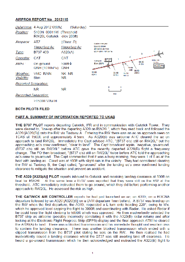On 4 August 2012 an Easyjet Airbus A320 on approach to London Gatwick was given landing clearance in IMC for a runway occupied by a Boeing 737-400 waiting for take off which heard this transmission. Despite normal ground visibility and an unrestricted view of the runway, ATC failed to recognise their error and, after two unsuccessful attempts to advise them of it, the commander of the 737 instructed the A320 to go around which it did. Only upon hearing this did the controller realise what had happened.