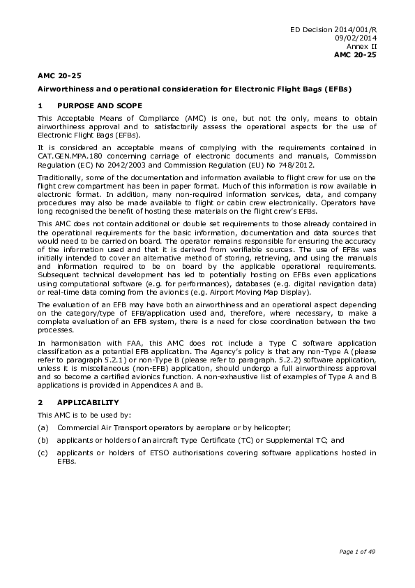This Acceptable Means of Compliance (AMC) is one, but not the only, means to obtain airworthiness approval and to satisfactorily assess the operational aspects for the use of Electronic Flight Bags (EFBs).