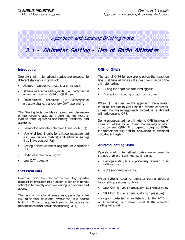Approach and Landing Briefing Note 3.1 - Altimeter Setting - Use of Rdio Altimeter