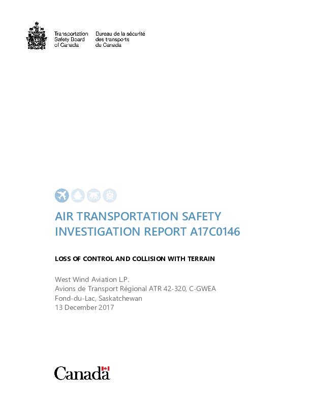 On 13 December 2017, control of an ATR 42-300 was lost just after it became airborne at night from Fond-du-Lac and it was destroyed by the subsequent terrain impact. Ten occupants sustained serious injuries from which one later died and all others sustained minor injuries. The Investigation found that the accident was primarily attributable to pre-takeoff ice contamination of the airframe with an inappropriate pilot response then preventing an achievable recovery. It was found that significant airframe ice accretion had gone undetected during an inadequate pre-flight inspection and that there was a more widespread failure to recognise airframe icing risk.