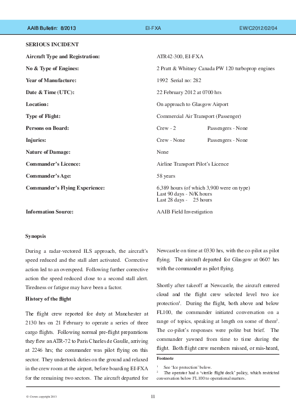 On 22 February 2012, the crew of an Air Contractors ATR 42 making a radar-vectored ILS approach to runway 23 at Glasgow at night allowed the airspeed of the aircraft to reduce and a stall warning followed. Corrective action then led to an overspeed and further corrective action almost led to a second stall warning. The Investigation concluded that SOPs were not followed, monitoring was ineffective and crew cooperation during recovery was poor. It was considered that crew performance may have been affected by inadequate rest prior to a night flying duty period.