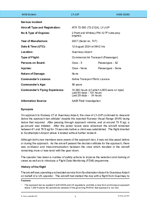 On 12 August 2024, an ATR 72-500 making a Category 1 ILS approach to Guernsey with thick fog breached the applicable Approach Ban by continuing its descent below the applicable minimum altitude of 1,000 feet agl and then continued below what would have been the applicable 200 feet agl Decision Altitude without any visual reference. At around 70 feet agl, a go around was called but not correctly commenced and the aircraft passed close to an unseen mast north of the runway before it eventually climbed. In the absence of any visibility improvement, a diversion to Southampton then followed.