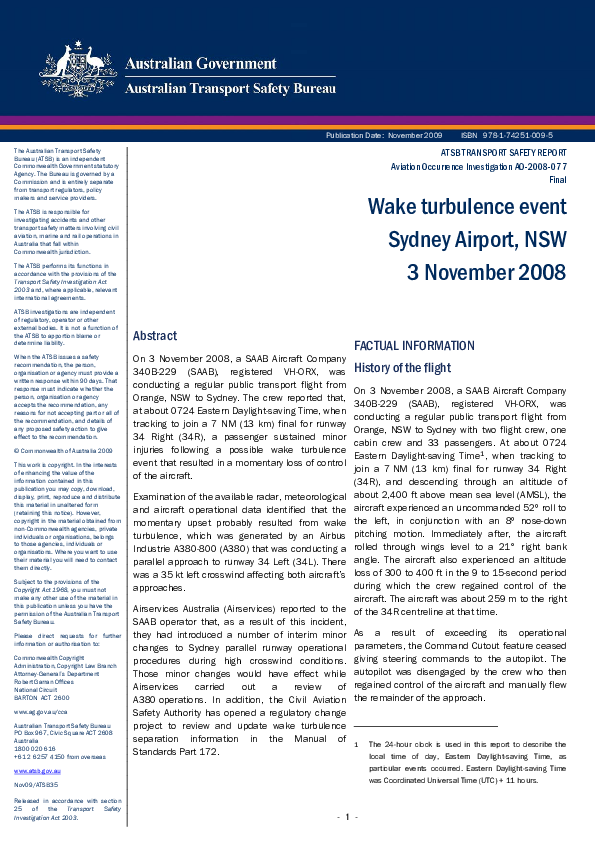 ATSB - Occurrence Investigation Report AO-2008-077 Wake turbulence SF23, Sydney 3 November 2008