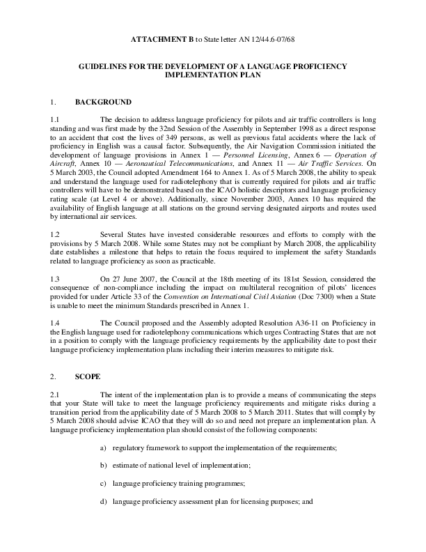 Attachment C to ICAO State Letter concerning language provisions to ensure that air traffic personnel and pilots are proficient in conducting and comprehending radiotelephony communications in the English language, including requirements that the English language shall be available on request at all stations on the ground serving designated airports and routes used by international air services