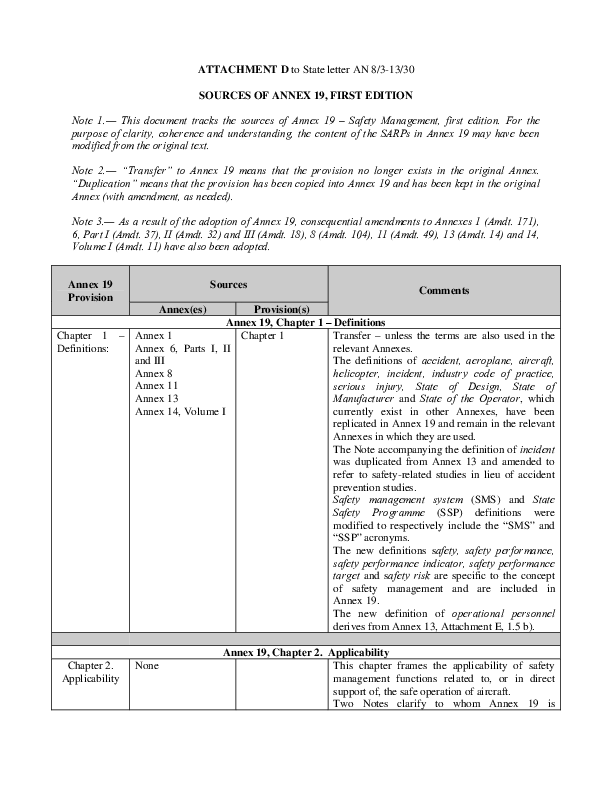 Mapping of existing safety management provisions from existing ICAO Annexes to Annex 19 - Safety Management.