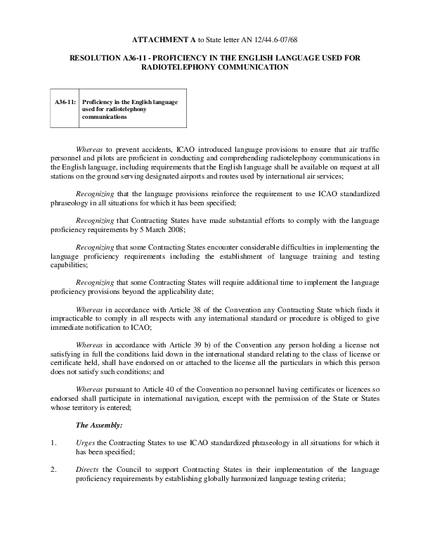 Attachment A to State letter AN 12/44.6-07/68, Resolution A36-11 Proficiency in the English lang