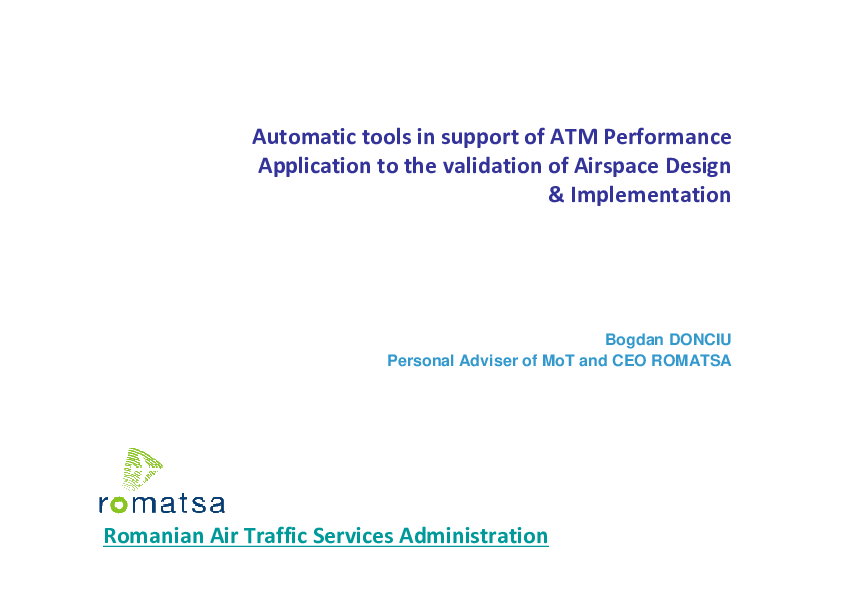 This presentation provides in the first part some general information about ROMATSA (IFR traffic evolution, strategic action lines), the regulatory context- regulation 691/2010 regarding the performance scheme and in the second part, it is focused on the application to the validation of a new or restructured airspace using ASMT.