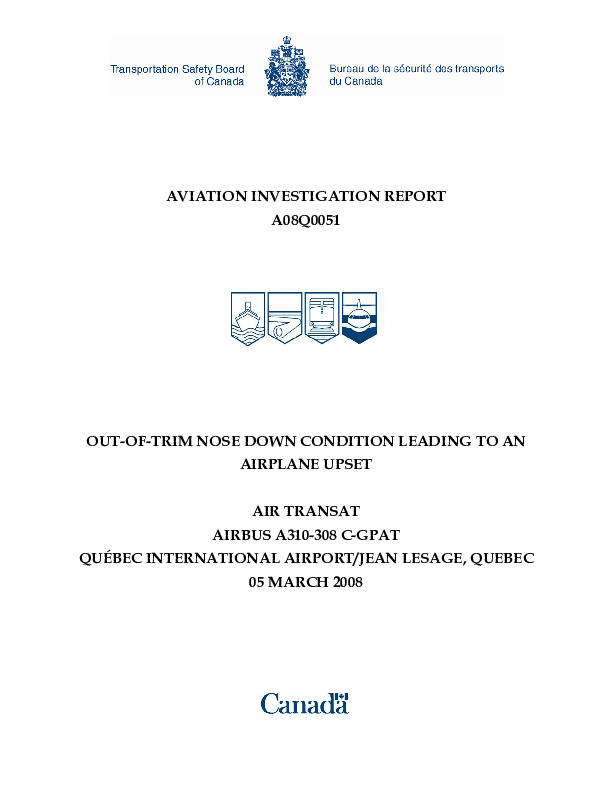 Aviation Investigation Report A08Q0051, A310 temporary loss of control, Quebec, Canada, 5 March 2008