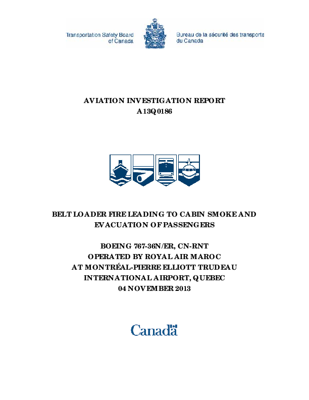 On 4 November 2013, smoke began to appear in the passenger cabin of a Boeing 767 which had just begun disembarking its 243 passengers via an airbridge after arriving at Montreal. The source was found to be a belt loader in position at the rear of the aircraft which had caught fire. Emergency evacuation using the airbridge only was ordered by the aircraft commander but cabin conditions led to other exits being used too. The fire was caused by a fuel leak and absence of an emergency stop button had prevented it being extinguished until the airport fire service arrived.