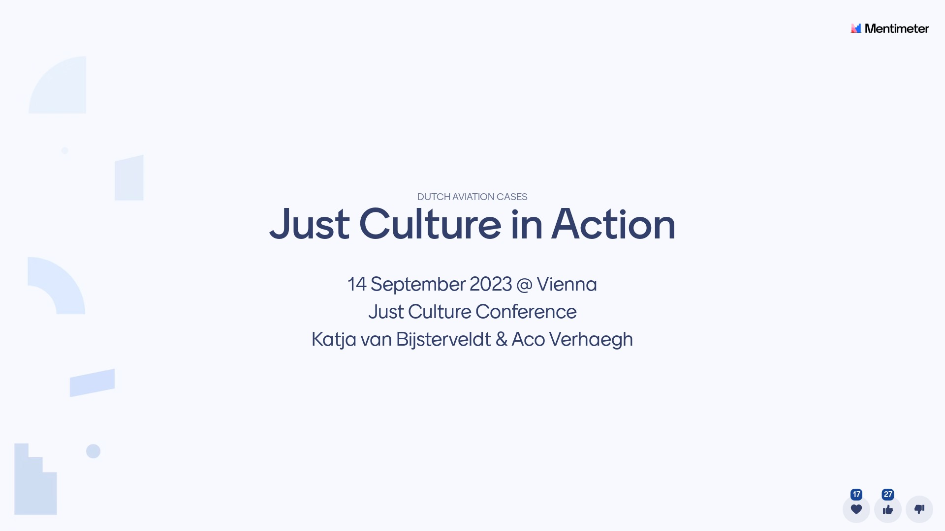 A presentation titled "Balancing justice and safety in Dutch aviation cases" presented on 14 September 2023 as part of the 2023 Just Culture conference titled "Just Culture & the Judiciary - Exploring Safety for all in a Culture of Justice".