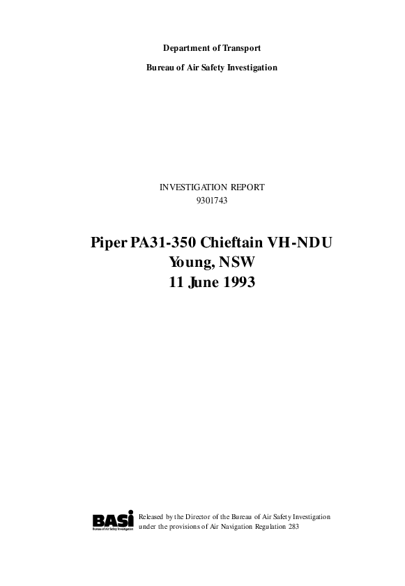 Department of Transport Bureau of Air Safety Investigation (Australia) INVESTIGATION REPORT 9301743 Piper PA31-350 Chieftain VH-NDU Young, NSW 11 June 1993