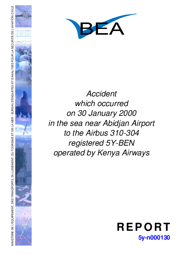 On 30 January 2000, an Airbus 310 took off from Abidjan (Ivory Coast) bound for Lagos, Nigeria then Nairobi, Kenya. Thirty-three seconds after take-off, the airplane crashed into the Atlantic Ocean, 1.5 nautical miles south of the runway at Abidjan Airport. 169 persons died and 10 were injured in the accident.