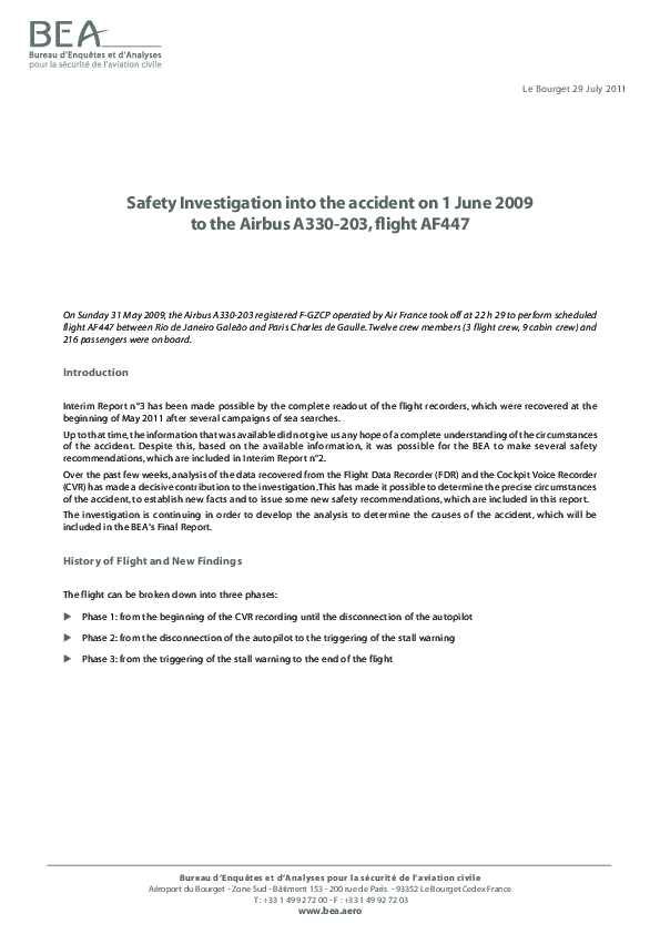 BEA - Interim Report 3 Flight AF 447, 1 June 2009 - Synthesis Note