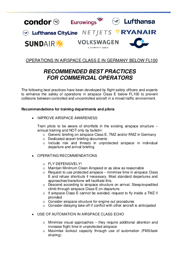 The following best practices have been developed by flight safety officers and experts to enhance the safety of operations in airspace Class E below FL100 to prevent collisions between controlled and uncontrolled aircraft in a mixed traffic environment.