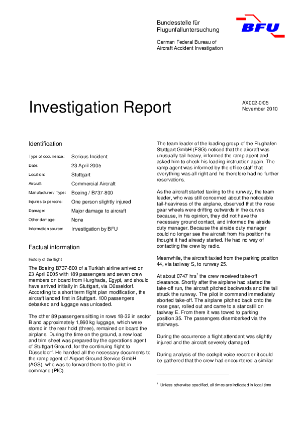 On 23 April 2005, a Boeing 737-800 being operated by Turkish charter airline Sky Air on a passenger flight from Stuttgart to Dusseldorf tipped onto its tail when take off thrust was applied for the intended departure from Runway 25 in normal day visibility. The attempt to take off was immediately abandoned and the aircraft towed back to the gate for the 100 passengers to disembark. One of the cabin crew was slightly injured and the aircraft was ‘severely damaged’.