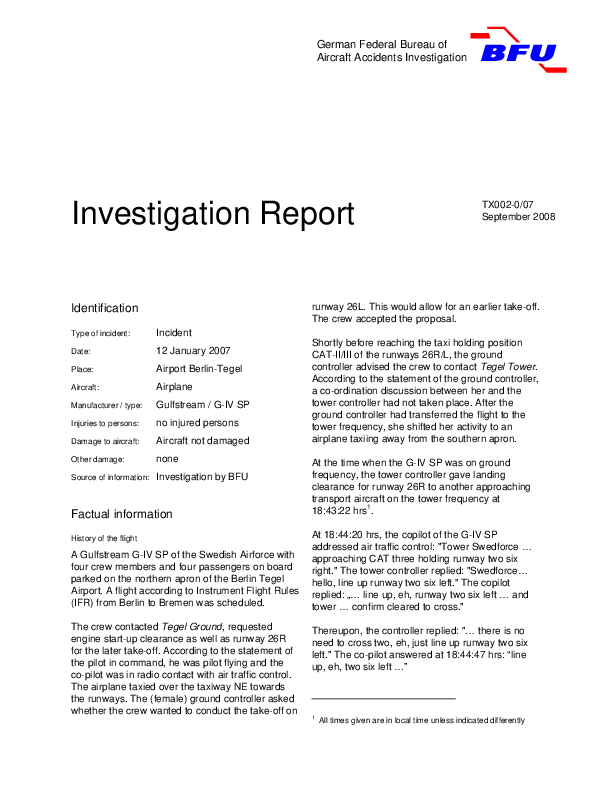 On 12 January 2007, a Gulfstream G-IV operated by Swedish Air Force nearly crossed an active landing runway at night with landing traffic imminent at Berlin-Tegel Airport. An inappropriate taxi clearance had been given to the aircraft by ATC due to both inadequate situational awareness and coordination between Ground and Tower positions. The crew questioned the ATC instructions several times, and this led to stopping the aircraft before crossing the holding point of the active runway.