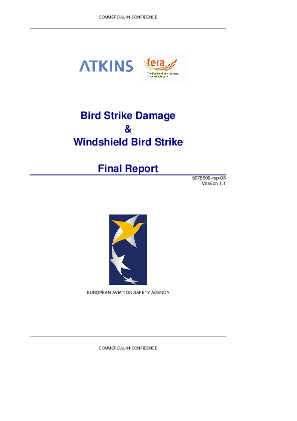 This report presents the findings of a study carried out by Atkins and the UK Food & Environment Research Agency (FERA). The study was commissioned in 2009 by the European Aviation Safety Agency (EASA), under contract number EASA.2008.C49 [1.]. Its aim was to investigate the adequacy of the current aircraft certification requirement in relation to current and future bird strike risks on aircraft structures and windshields.
