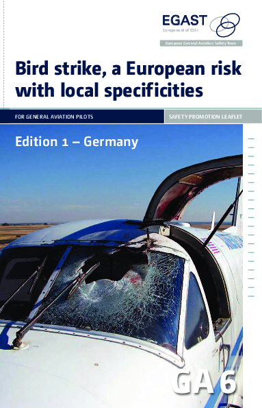 Safety promotion leaflet on bird strikes. The edition 1 covers Germany and is a translation of a German AOPA Safety Letter. Birds are found everywhere in Europe and the leaflet will be extended over time to cover other countries.
