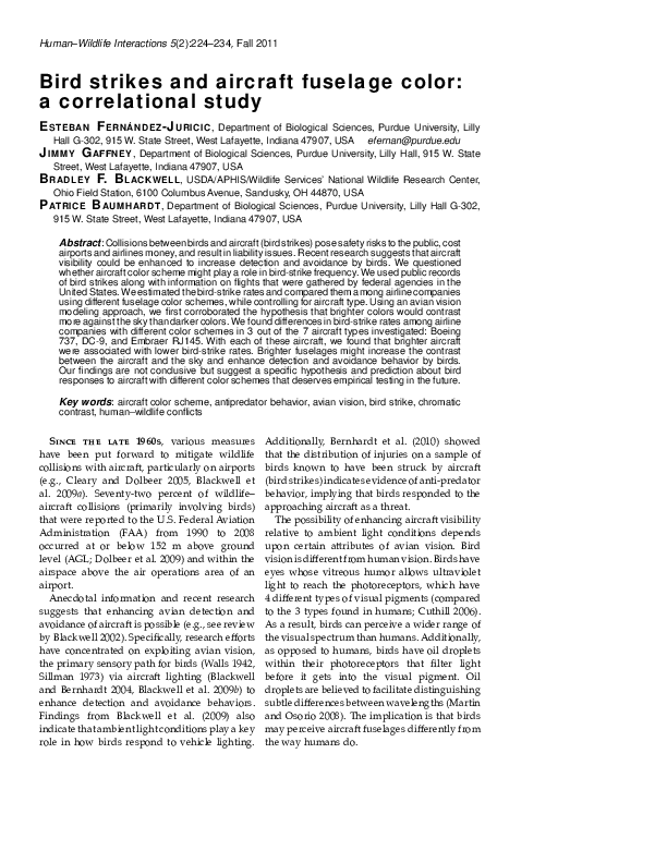 Abstract: Collisions between birds and aircraft (bird strikes) pose safety risks to the public, cost airports and airlines money, and result in liability issues. Recent research suggests that aircraft visibility could be enhanced to increase detection and avoidance by birds. We questioned whether aircraft color scheme might play a role in bird-strike frequency. We used public records of bird strikes along with information on fl ights that were gathered by federal agencies in the United States. We estimated the bird-strike rates and compared them among airline companies using different fuselage color schemes, while controlling for aircraft type. Using an avian vision modeling approach, we first corroborated the hypothesis that brighter colors would contrast more against the sky than darker colors. We found differences in bird-strike rates among airline companies with different color schemes in 3 out of the 7 aircraft types investigated: Boeing 737, DC-9, and Embraer RJ145. With each of these aircraft, we found that brighter aircraft were associated with lower bird-strike rates. Brighter fuselages might increase the contrast between the aircraft and the sky and enhance detection and avoidance behavior by birds. Our findings are not conclusive but suggest a specific hypothesis and prediction about bird responses to aircraft with different color schemes that deserves empirical testing in the future.
