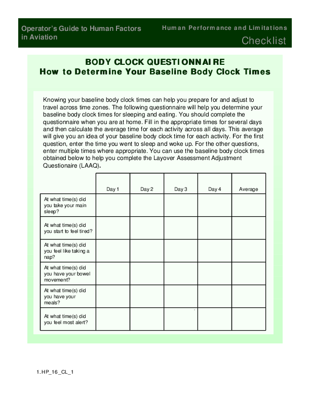 This questionnaire will help pilots determine their baseline body clock times for sleeping and eating.