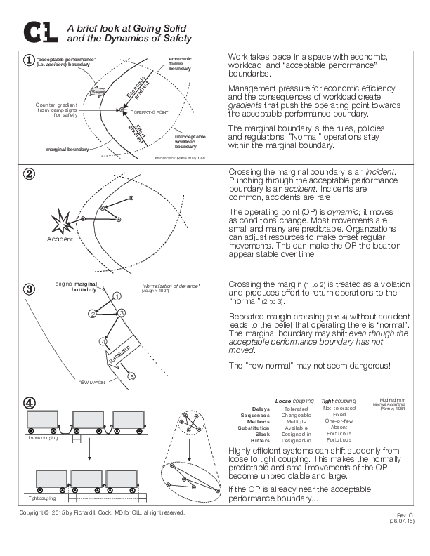 Work takes place in a space with economic, workload, and “acceptable performance boundaries.Management pressure for economic efficiency and the consequences of workload create gradients that push the operating point towards the acceptable performance boundary. The marginal boundary is the rules, policies, and regulations. Normal operations stay within the marginal boundary. This document represents a brief look at the dynamics of safety.