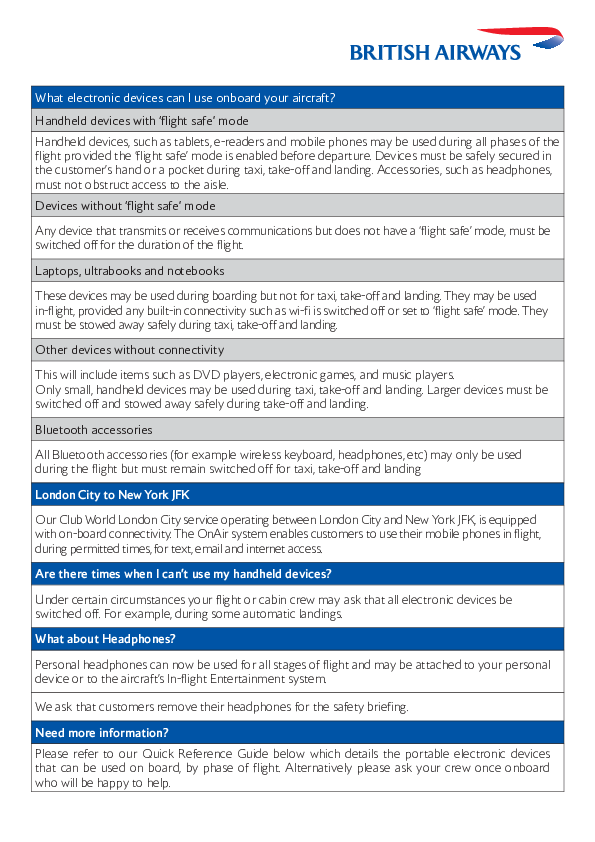 British Airways Policy for on-board use of PEDs