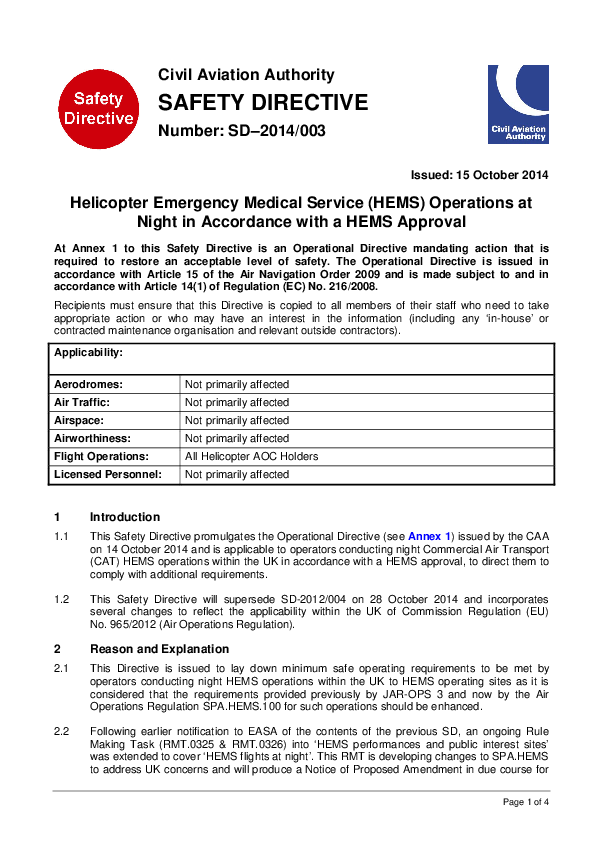 Helicopter Emergency Medical Service (HEMS) Operations at Night in Accordance with a HEMS Approval - issued 15 October 2014