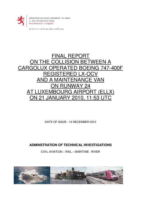 FINAL REPORT ON THE COLLISION BETWEEN A CARGOLUX OPERATED BOEING 747-400F REGISTERED LX-OCV AND A MAINTENANCE VAN ON RUNWAY 24 AT LUXEMBOURG AIRPORT (ELLX) ON 21 JANUARY 2010, 11:53 UTC