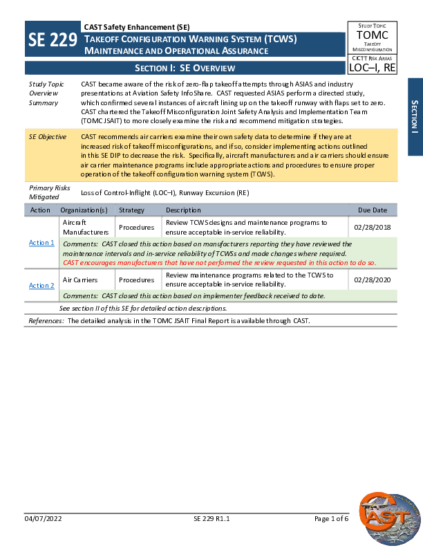 CAST SE 229 R1.1 - Takeoff Misconfiguration - Takeoff Configuration Warning System Maintenance and Operational Assurance