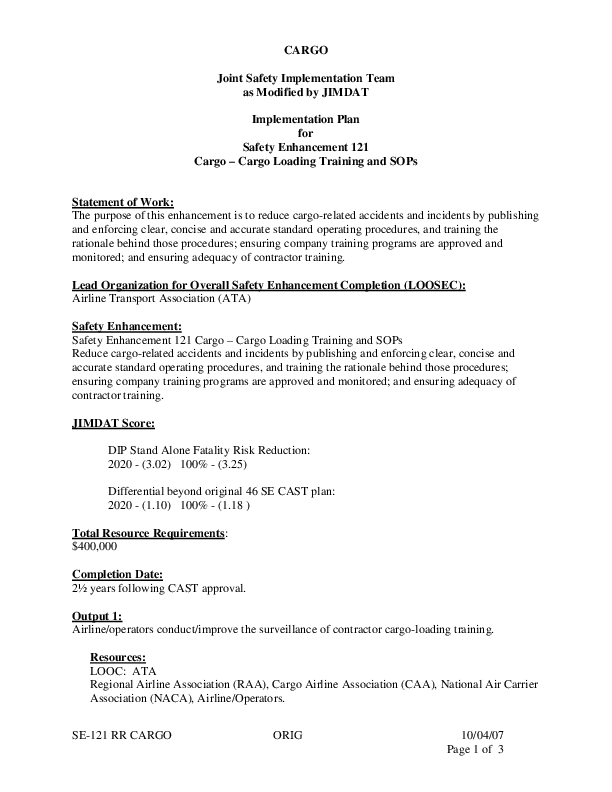 CAST - SE121 DIP Safety Enhancement 121 Cargo †Cargo Loading Training and SOPs