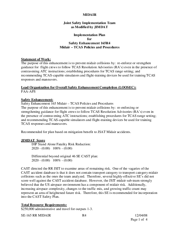 CAST - SE165 DIP Midair Safety Enhancement 165R4 Midair, TCAS Policies and Procedures