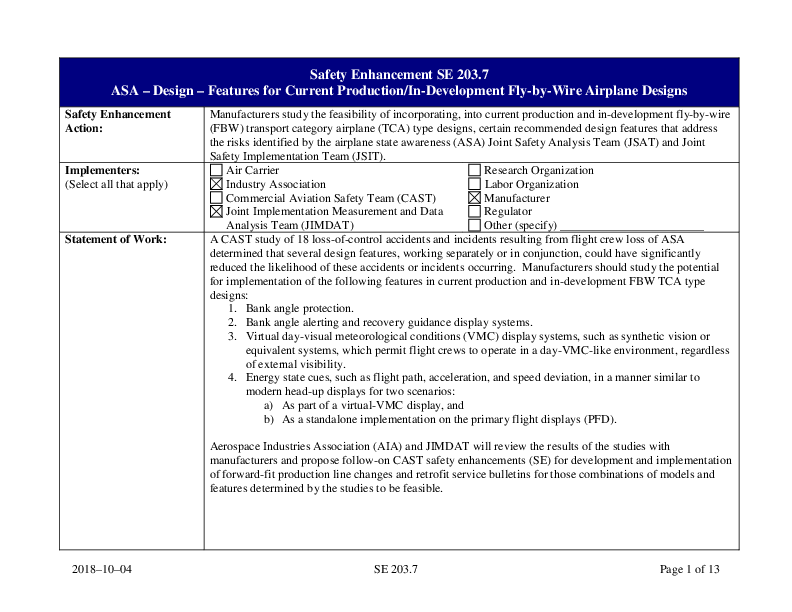 Detailed Implementation Plan for SE203: Airplane State Awareness - Features for Current Production or In-Development Fly-by-Wire Airplane Designs (Rev 203.7)