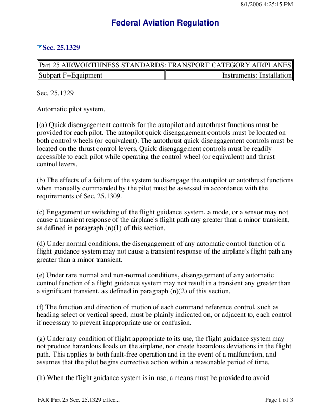 Federal Aviation Administration (FAA) Code of Federal Regulations 25.1329: Part 25 AIRWORTHINESS STANDARDS: TRANSPORT CATEGORY AIRPLANES Subpart F--Equipment Instruments: Installation Amended by Amdt. 25-119, Eff. 5/11/06