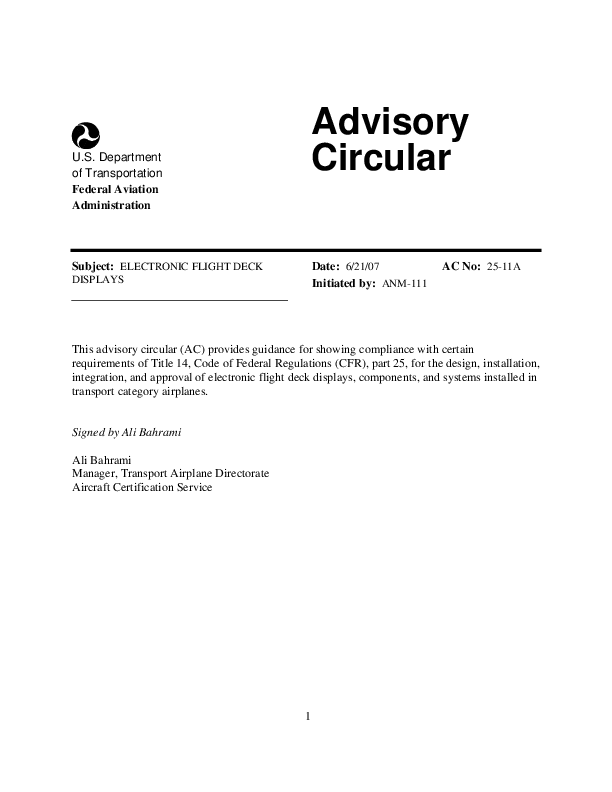 CANCELLED - SUPERSEDED BY AC 25-11B Federal Aviation Administration (FAA) Advisory Circular AC 25-11A, Electronic Flight Deck Displays