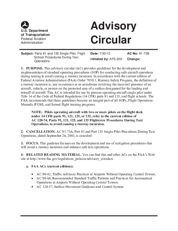 FAA Advisory Circular 91-73B, Part 91 Pilot and Flight Crew Procedures during Taxi Operations and Part 135 Single-Pilot Operations
