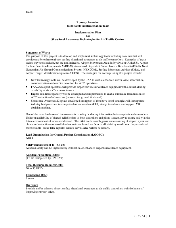 Detailed Implementation Plan for Safety Enhancement 53 - Runway Incursion (RI) Situational Awareness Technology for ATC Enhanced Airport Surveillance Equipment