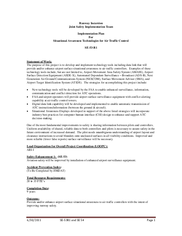 Detailed Implementation Plan for SE53: Situational Awareness Technology for ATC � Enhanced Airport Surveillance Equipmen
