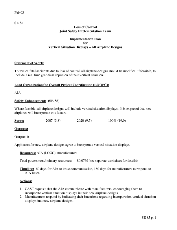 Detailed Implementation Plan for Safety Enhancement 85 - Vertical Situation Display (VSD)
