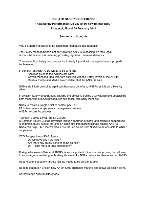 This document represents the summary of thoughts of the CEOs after attending the meeting about ATM safety performance.
