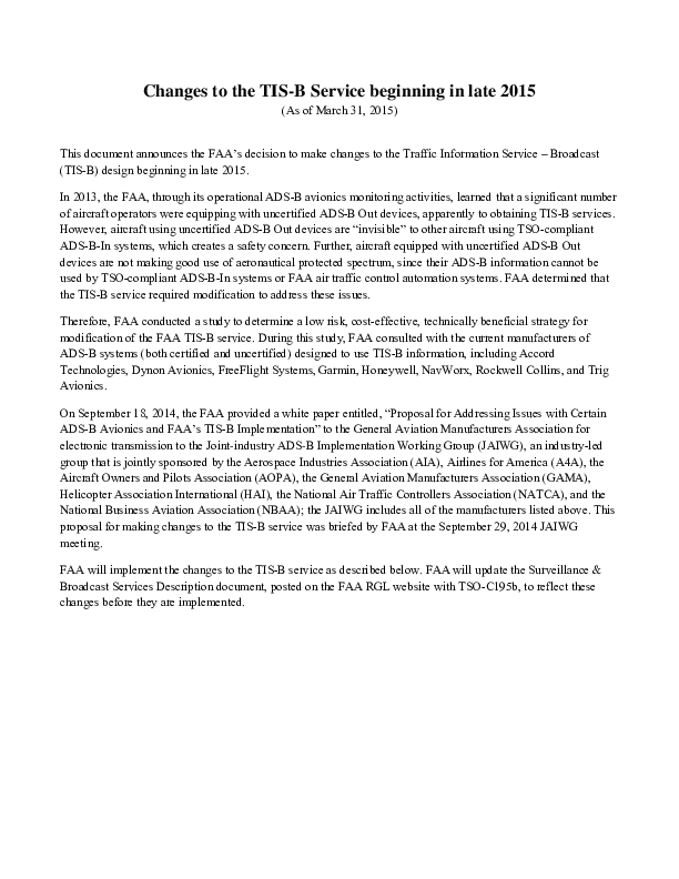 Changes to the TIS-B Service beginning in late 2015